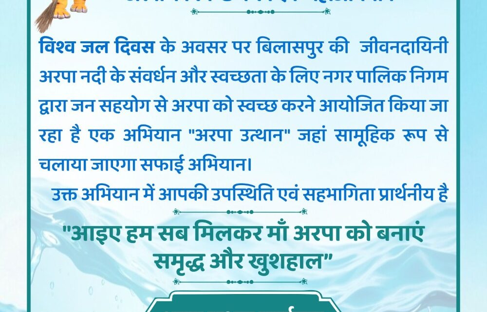 22 मार्च शनिवार को अरपा उत्थान महाअभियान नवनिर्मित रामसेतु मार्ग (नया रिवर व्यू) में चलाया जाएगा। तट के नीचे अरपा नदी में आमजन की सहभागिता से स्वच्छता का एक बड़ा संदेश दिया जाएगा। अभियान सुबह 6 बजे शुरू होगा। इस महाअभियान में बड़ी संख्या में अपनी सहभागिता देने की अपील नगर निगम बिलासपुर द्वारा की गई है।