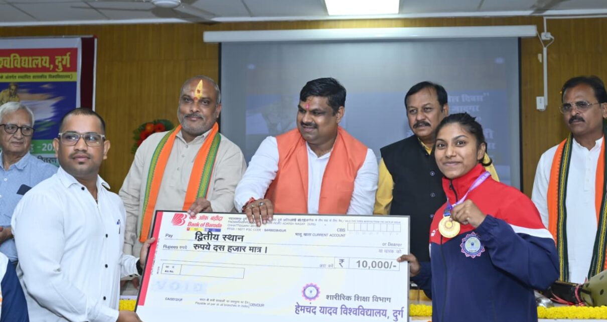 ग्रामोद्योग मंत्री श्री गजेन्द्र यादव ने कहा कि दुर्ग जिले में खेल प्रतिभाओं के लिए निरंतर आधारभूत संसाधन उपलब्ध कराए जा रहे हैं। उन्होंने बताया कि दुर्ग के रविशंकर स्टेडियम को बीसीसीआई द्वारा दुर्ग में अंतर्राष्ट्रीय क्रिकेट स्टेडियम का निर्माण प्रस्तावित है। आधुनिक बैडमिंटन कोर्ट का निर्माण पूर्ण हो गया है, जल्द ही लोकार्पण किया जाएगा, स्टेशन रोड में स्विमिंग पूल का निर्माण कराया जा रहा है। नयापारा में अत्याधुनिक जिम प्रस्तावित है। नाना नानी पार्क के पास जॉगिंग ट्रैक भी तैयार होने वाला है। उन्होंने विश्वास जताया कि इन सुविधाओं के माध्यम से दुर्ग जिले के खिलाड़ी अब राष्ट्रीय ही नहीं बल्कि अंतर्राष्ट्रीय स्तर पर भी अपनी प्रतिभा का प्रदर्शन करेंगे। इस अवसर पर मुख्य अतिथि एवं अन्य अतिथियों द्वारा विश्वविद्यालय के 34 विद्यार्थियों को राष्ट्रीय स्तर के खेल प्रतियोगिताओं में विजेता होने पर सम्मानित किया गया।
