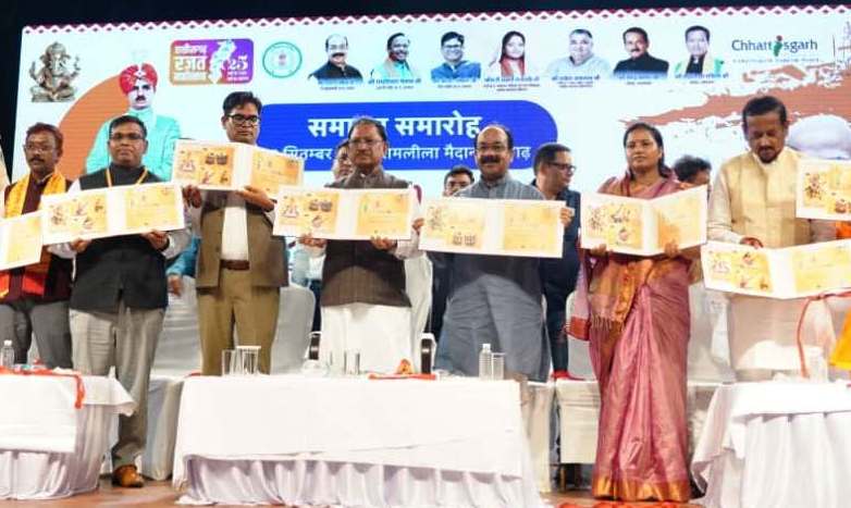 रायगढ़, 08 सितम्बर 2025/sns/- रायगढ़ में 5 सितंबर को 40 वीं चक्रधर समारोह के समापन कार्यक्रम में मुख्यमंत्री श्री विष्णुदेव साय द्वारा चक्रधर समारोह 2025 पर विशेष आवरण एवं पिक्चर पोस्टकार्ड सेट का विमोचन किया गया। इस अवसर पर उप मुख्यमंत्री श्री अरुण साव, वित्त मंत्री श्री ओ.पी चौधरी, महिला एवं बाल विकास मंत्री श्रीमती लक्ष्मी राजवाड़े, राज्यसभा सांसद श्री देवेंद्र प्रताप सिंह, महापौर श्री जीवर्धन चौहान, डाक विभाग से श्री दिनेश कुमार मिस्त्री, निदेशक डाक सेवाएं छत्तीसगढ़ परिमंडल एवं श्री नरेंद्र राजपाल, अधीक्षक डाकघर रायगढ़ भी उपस्थित रहे।