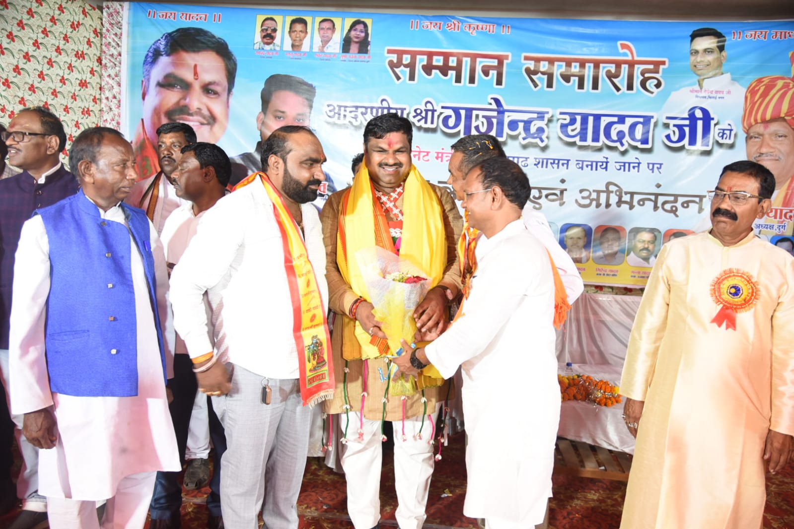 दुर्ग, 08 सितम्बर 2025/sns/- स्कूल शिक्षा मंत्री श्री गजेन्द्र यादव आज रिसाली दशहरा मैदान भिलाई में आयोजित छत्तीसगढ़ झेरिया यादव समाज के विशाल अभिनंदन समारोह में शामिल हुए। मंत्री श्री यादव के पहुंचने पर समाज की पारंपरिक टोली ने नाचते-गाते हुए उनका जोरदार स्वागत किया। समारोह में मंत्री जी को विशेष पारंपरिक वेशभूषा पहनाई गई और उनके हाथ में सजी हुई लाठी भी भेंट की गई, जो यादव समाज की सांस्कृतिक पहचान का प्रतीक है। मंत्री श्री यादव को विभिन्न जिलों से आए यादव समाज के गणमान्य लोगों ने माला पहनाकर स्वागत किया। स