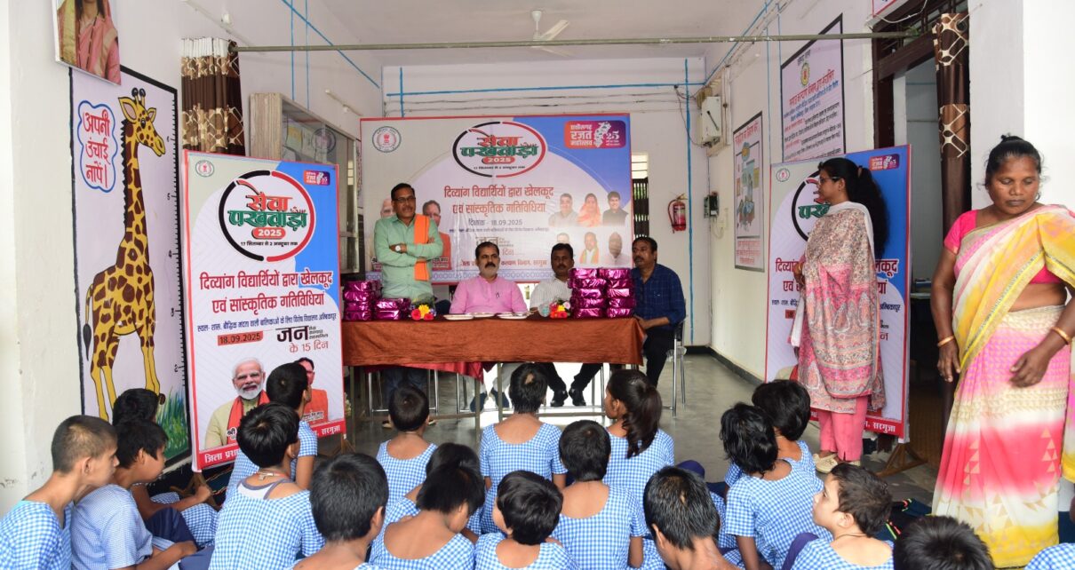 अम्बिकापुर, 19 सितम्बर 2025/sns/- ’’सेवा पखवाड़ा’’ 2025 अंतर्गत समाज कल्याण विभाग द्वारा संचालित दिव्यांग विद्यार्थियों के विशेष विद्यालय में गुरुवार को खेल-कूद प्रतियोगिता एवं विभिन्न सांस्कृतिक गतिविधियां आयोजित की गई। कार्यक्रम में नगर पालिक निगम अम्बिकापुर सभापति श्री हरमिन्दर सिंह टिन्नी, जनप्रतिनिधियों में डॉ शिवमंगल सिंह, श्री मनोज गुप्ता उपस्थित रहे। नगर पालिक निगम के सभापति श्री टिन्नी द्वारा दिव्यांग बच्चों के प्रतिभाओं की सराहना की। उन्होंने बच्चों का उत्साहवर्धन करते हुए कहा कि ये बच्चे प्रतिभावान हैं, बच्चों मे अद्भुत क्षमता है। इस अवसर पर जिला विधिक सेवा प्राधिकरण द्वारा दिव्यांग बच्चों के अधिकार, सुरक्षा एवं संरक्षण पर विधिक जानकारी प्रदान की गई। समाज कल्याण विभाग के उप संचालक श्री व्ही.के. उके द्वारा दिव्यांग स्कूलों के संबंध में जानकारी प्रदान की गई। इस दौरान शासकीय बौद्धिक मंदता विद्यालय अम्बिकापुर में खेल-कूद प्रतियोगिता के तहत कुर्सी दौड़, 100 मीटर दौड़, पेंटिग का आयोजन किया गया तथा विद्यार्थियों द्वारा संगीत प्रस्तुत किया गया। इसी तरह होलीक्रास आशा निकुंज श्रवण बाधित विशेष विद्यालय अम्बिकापुर द्वारा पेंटिग, स्लोगन लेखन, बलून शर्ट, चना चम्मच, बलून ढूढ़ना, न्यूज पेपर फाड़ना, तीन पैर दौड़, गेंद फेंकना, आलू जमा करना, एकल नृत्य, छत्तीसगढ़ी नृत्य की प्रस्तुती दी गई। इस दौरान प्रतिभागी बच्चों को पुरस्कृत किया गया। कार्यक्रम के दौरान शासकीय बौद्धिक मंदता विद्यालय अम्बिकापुर की प्रभारी अधीक्षक श्रीमती शाबरा बी. खान, होलीक्रास आशा निकुंज श्रवण बाधित विशेष विद्यालय अम्बिकापुर से सिस्टर श्वेता तथा विभागीय कर्मचारी उपस्थित थे।