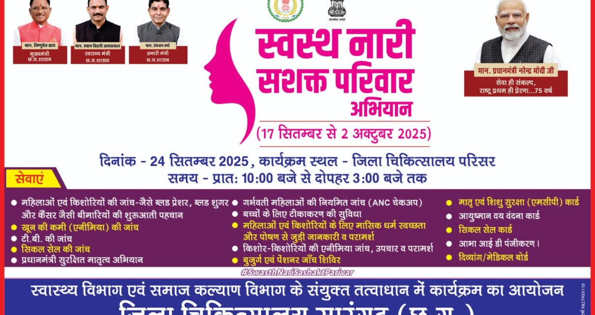 सारंगढ़ बिलाईगढ़, 25 सितंबर 2025/sns/- जिला अस्पताल सारंगढ़ में प्रत्येक बुधवार को सुबह 10 बजे से मेडिकल और दिव्यांग बोर्ड का आयोजन किया जा रहा है। इसी सिलसिले में प्रत्येक पहले और चौथे बुधवार को बच्चों के शिशु रोग और आंखों के नेत्र रोग का दिव्यांगता प्रमाण पत्र बनाया जाता है। इसी हॉस्पिटल में सेवा पखवाड़ा अंतर्गत स्वस्थ नारी सशक्त परिवार अभियान में महिला संबंधी लगभग सभी प्रकार के बीमारियों का इलाज किया जाएगा।