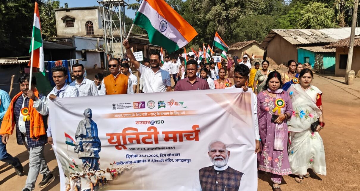 जगदलपुर, 24 नवम्बर 2025/sns/- खेल एवं युवा कल्याण, विभाग द्वारा जिला बस्तर में एकता मार्च (यूनिटी मार्च)का आयोजन सोमवार को विकासखण्ड बकावंड के ग्राम पंचायत करीतगांव से प्रारंभ किया गया जिसका समापन टाउन क्लब जगदलपुर के प्रागण में किया जाएगा। भारत की एकता और अखंडता के प्रतीक लौह पुरुष सरदार वल्लभभाई पटेल की 150वीं जयंती के अवसर पर आज बस्तर में यूनिटी मार्च का भव्य आयोजन किया गया। इस कार्यक्रम में जनप्रतिनिधि, अधिकारी, सामाजिक कार्यकर्ता, युवा एवं बड़ी संख्या में स्थानीय नागरिक शामिल हुए।