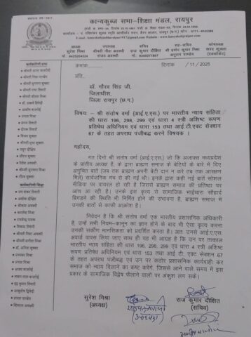 आई ए एस संतोष वर्मा के द्वारा ब्राह्मण समाज के बेटियों को अपने बेटे को कन्यादान और संबंध बनाने जैसे घृणित वाक्य का प्रयोग करके ब्राह्मण समाज को अपमानित किया गया इसके विरोध में आज कान्यकुब्ज ब्राह्मण समाज के पदाधिकारी एवम सदस्य गण और मात्रृ शक्तियों के द्वारा एसपी कार्यालय और कलेक्टआज एक ज्ञापन दिया गया और मांग किया गया कि इस व्यक्ति पर कठोर कानूनी कार्यवाही हो और ब्राह्मण समाज से माफी मांगे सैकड़ो के तादाद में ब्राह्मण समाज की उपस्थिति ब्राह्मण एकता को दर्शाती है इसी तरह से सदैव ब्राह्मण समाज के सभी समिति संगठन के लोगों को एक साथ एकत्रित होकर के ब्राह्मण समाज के हित के लिए आवश्यक आवाज उठाते रहना चाहिए आज ज्ञापन देने वालों में सर्वप्रथम कान्यकुब्ज ब्राह्मण समाज के सचिव श्री राजकुमार दीक्षित उपाध्यक्ष श्री संजय अवस्थी कोषाध्यक्ष श्री शरद शुक्ला सह सचिव श्री प्रमोद मिश्रा कार्यकारिणी सदस्यश्री आशीष बाजपेई श्री राघवेंद्र पाठक श्री अमित बाजपेई श्री मन्नू बाजपेई आदि उपस्थित थे