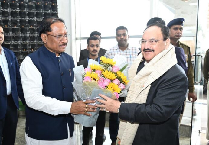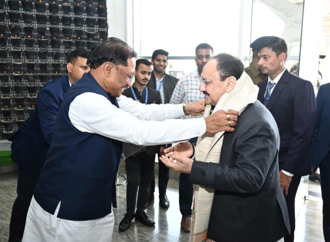 मुख्यमंत्री श्री विष्णुदेव साय ने केंद्रीय स्वास्थ्य एवं परिवार कल्याण मंत्री श्री जे पी नड्डा का किया आत्मीय स्वागत