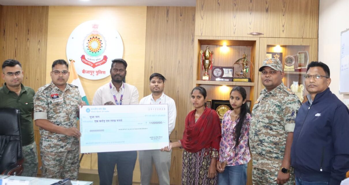 इस अवसर पर पुलिस अधीक्षक डॉ. जितेन्द्र कुमार यादव, अतिरिक्त पुलिस अधीक्षक (ऑप्स) श्री अमन कुमार झा, अतिरिक्त पुलिस अधीक्षक श्री चन्द्रकांत गवर्ना, स्टेट बैंक ऑफ इंडिया बीजापुर के शाखा प्रबंधक श्री अभय प्रताप सिंह, बीडीएम श्री विजय झाड़ी एवं अन्य अधिकारीगण उपस्थित रहे। यह सहायता राशि शहीद जवान के परिवार के प्रति सम्मान, कृतज्ञता एवं संबल प्रदान करने की दिशा में एक महत्वपूर्ण कदम है, शहीद आरक्षक दिनेश नाग का बलिदान सदैव स्मरणीय रहेगा।