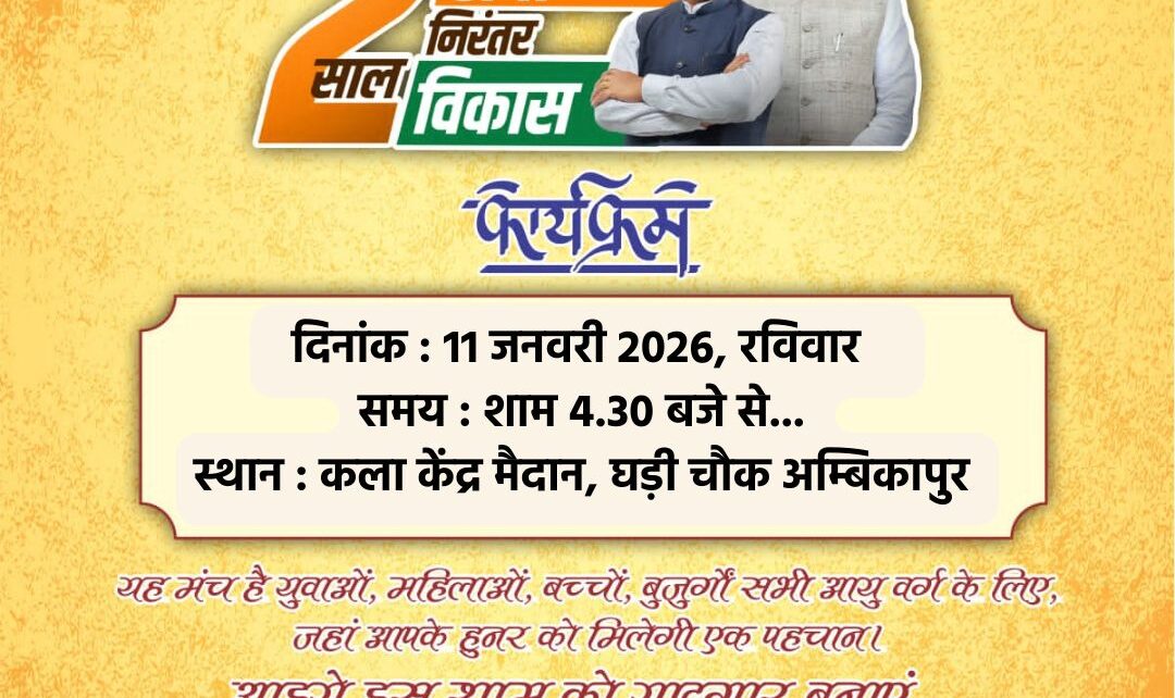 अंबिकापुर, 10 जनवरी 2026/sns/- राज्य शासन के 2 वर्ष पूर्ण होने के उपलक्ष्य में जनसंपर्क विभाग द्वारा 11 जनवरी 2026 को शाम 04ः30 बजे से अम्बिकापुर के कला केंद्र मैदान में “2 साल निरंतर सेवा निरंतर विकास“ कार्यक्रम का आयोजन किया जाएगा। जिसमें सभी आयु वर्ग के लोगों के लिए फन एक्टिविटी, डांस, म्यूजिक, प्रश्नोत्तरी सहित अन्य प्रतियोगिताएं आयोजित होंगी। जिसमें विजेता प्रतिभागियों को आकर्षक उपहार भी प्रदान किया जाएगा। कार्यक्रम में नागरिकों से अधिक से अधिक संख्या में उपस्थित होने अपील की गई है।