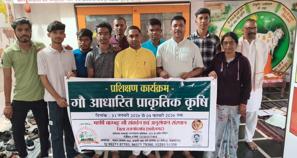 राजनांदगांव, 4 फरवरी 2026/sns/-महर्षि वाग्भट्ट गौ संवर्धन एवं अनुसंधान संस्थान जिला राजनांदगांव द्वारा 31 जनवरी से 4 फरवरी 2026 तक महामाया चौक बसंतपुर स्थित पंचगव्य विद्यापीठम् विस्तार केन्द्र में गौ आधारित प्राकृतिक कृषि विषय पर पांच दिवसीय प्रशिक्षण कार्यक्रम का आयोजन किया गया। प्रशिक्षण कार्यक्रम में गौ आधारित प्राकृतिक कृषि के लाभों के बारे में बताया गया तथा रासायनिक खेती से होने वाले मृदा, जल, पर्यावरण एवं मानव स्वास्थ्य पर होने वाले दुष्प्रभावों के बारे में विस्तृत जानकारी दी गई। प्रशिक्षक तनिष साहू ने प्रशिक्षणार्थियों को गौ आधारित प्राकृतिक कृषि की मूल अवधारणा तथा गाय के पंचगव्यों एवं स्थानीय वनस्पतियों व संसाधनों का उपयोग कर कम लागत में लाभकारी खेती के संबंध में जानकारी दी। प्रशिक्षण में जीवामृत, घनजीवामृत, बीजामृत, दशपर्णी अर्क सहित पंचगव्य आधारित जैव-उपचारों के निर्माण की विधियां, फसल पोषण, कीट-रोग प्रबंधन तथा मृदा स्वास्थ्य सुधार के उपायों के बारे में बताया गया। साथ ही प्रशिक्षणार्थियों की जिज्ञासाओं का समाधान किया गया।