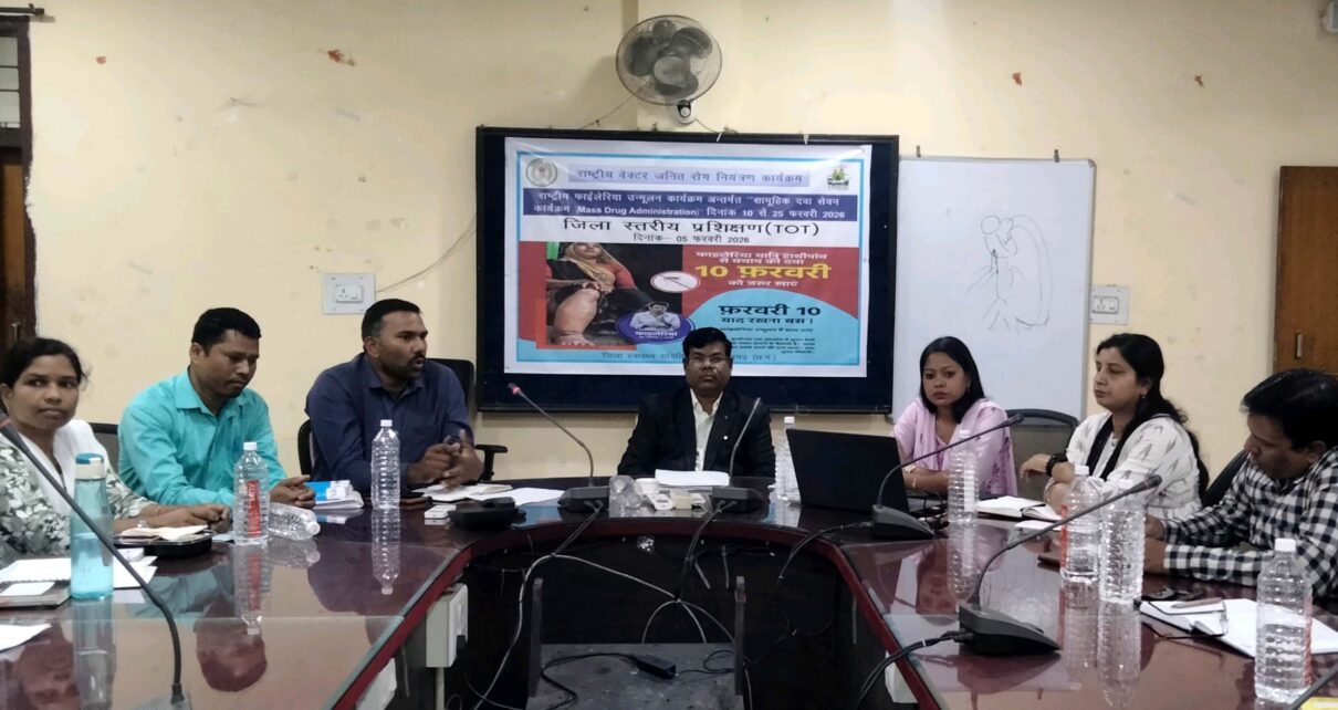 रायगढ़, 5 फरवरी 2026/sns/- कलेक्टर श्री मयंक चतुर्वेदी के निर्देशानुसार कार्यालय मुख्य चिकित्सा एवं स्वास्थ्य अधिकारी के सभाकक्ष में राष्ट्रीय फाइलेरिया उन्मूलन कार्यक्रम के अंतर्गत प्रशिक्षकों का प्रशिक्षण (टीओटी) सह मासिक समीक्षा बैठक आयोजित की गई। मुख्य चिकित्सा एवं स्वास्थ्य अधिकारी डॉ. अनिल कुमार जगत ने बताया कि राज्य स्तर से प्राप्त दिशा-निर्देशों के अनुसार विकासखंड घरघोड़ा एवं लोइंग, रायगढ़ अर्बन में फाइलेरिया दवा सेवन कार्यक्रम 10 से 25 फरवरी 2026 तक संचालित किया जाएगा। 10 से 12 फरवरी तक सभी आंगनबाड़ी केन्द्रों, स्कूलों, कॉलेजों, तकनीकी संस्थानों एवं स्वास्थ्य संस्थाओं में बूथ लगाकर हाथीपांव की दवा खिलाई जाएगी। इसी तरह 13 से 22 फरवरी तक स्वास्थ्य अमले द्वारा घर-घर जाकर दवा सेवन कराया जाएगा। शेष छूटे हुए व्यक्तियों को 23 से 25 फरवरी तक मॉप-अप राउंड के माध्यम से दवा का सेवन कराया जाएगा।