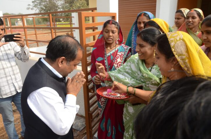 कलेक्टर डॉ. गौरव सिंह ने धरसींवा दौरे के दौरान ग्राम कांदुल के महतारी सदन पहुंचे जहां महिलाओं ने उनका तिलक लगाकर स्वागत किया ।