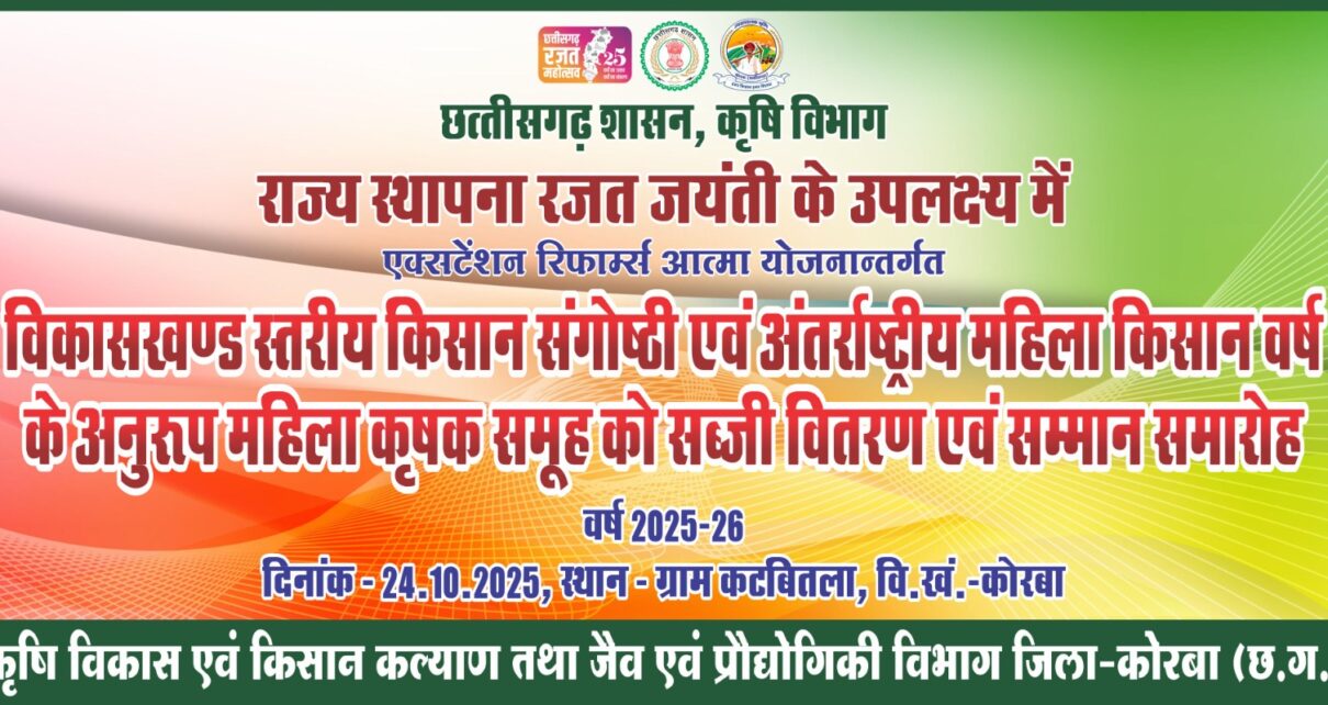 कोरबा, 25 अक्टूबर 2025/sns/- राज्य स्थापना रजत जयंती के उपलक्ष्य में विकासखंड कोरबा ग्राम कटबिटला में किसान संगोष्ठी का आयोजन किया गया। कार्यक्रम में कृषि विभाग के साथ संवर्गीय विभाग उद्यान, पशु चिकित्सा, मछली विभाग के अधिकारियों कर्मचारियों के द्वारा विभागीय योजनाओं के साथ तकनीकी जानकारी किसानों को प्रदान किया गया। साथ ही अंतरराष्ट्रीय महिला […]